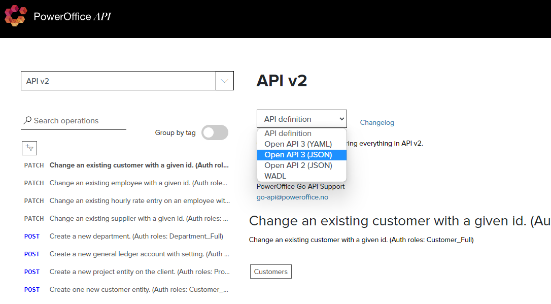 To get the OpenAPI spesification for API v2 you can download it from here (select "Open API 3 (JSON)" in the "API definition" dropdown menu): https://developer.poweroffice.net/api-details#api=apiv2_demo